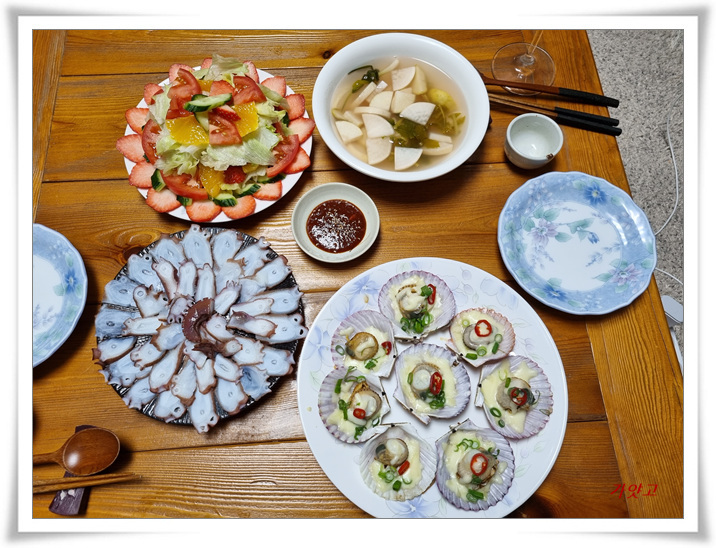 저녁상은 샐러드에 문어숙회에, 홍가리비 치즈구이도 먹고,