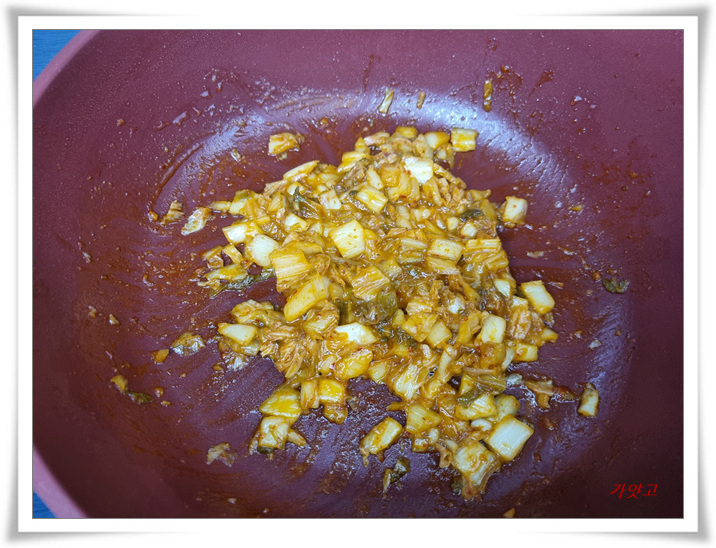 김치를 물 꼭 짜고, 총총 다져 들기름에 볶아두는데