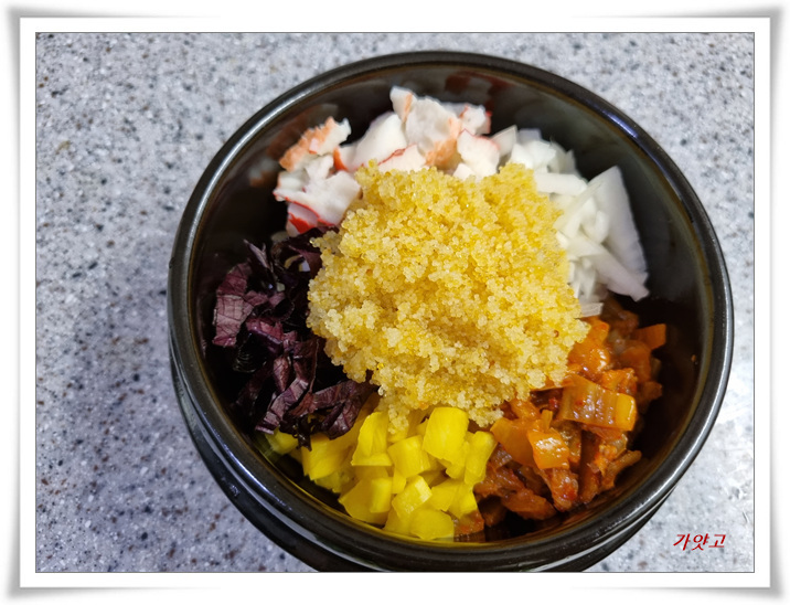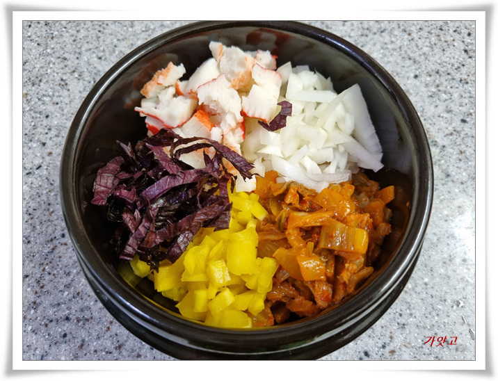 볶은 김치, 단무지, 자소엽, 꽃맛살, 양파를 올리고