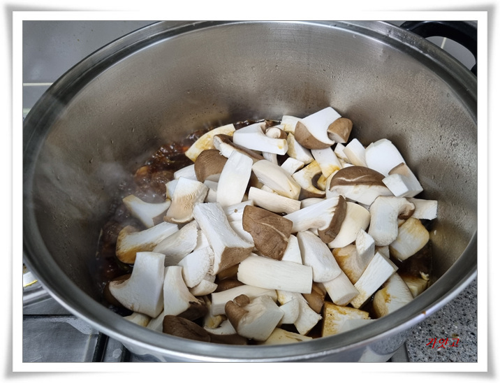30분 뒤에 새송이버섯부터 넣고 10분간 조려주고,