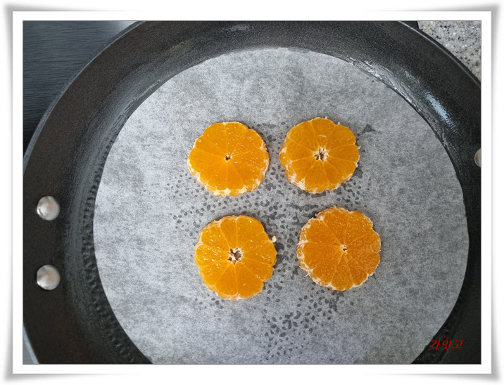 그 위에 모양내어 잘라둔 밀감을 올리고,