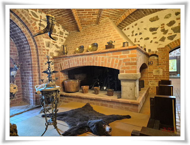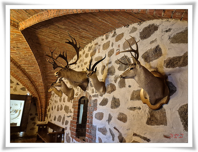 짐승뿔 장식과 벽난로 위의 그릇들