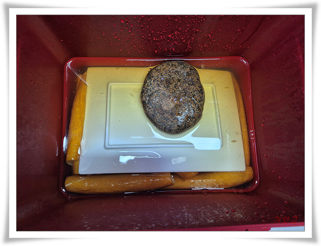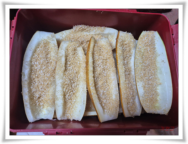 김치통에 노각을 자른 부위가 위로 오도록 놓고