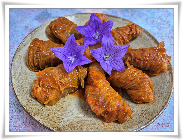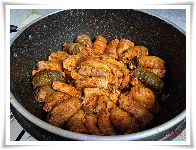 길고 넓은 잎들을 하나씩 묵은지에 말아줍니다.