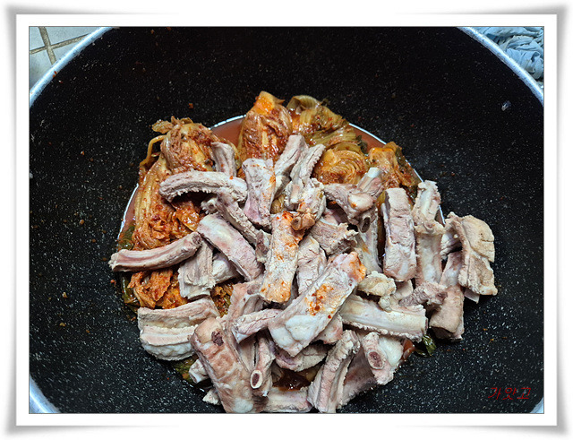 건져 식혀둔 돼지등갈비를 묵은지 위에 쏟아놓고