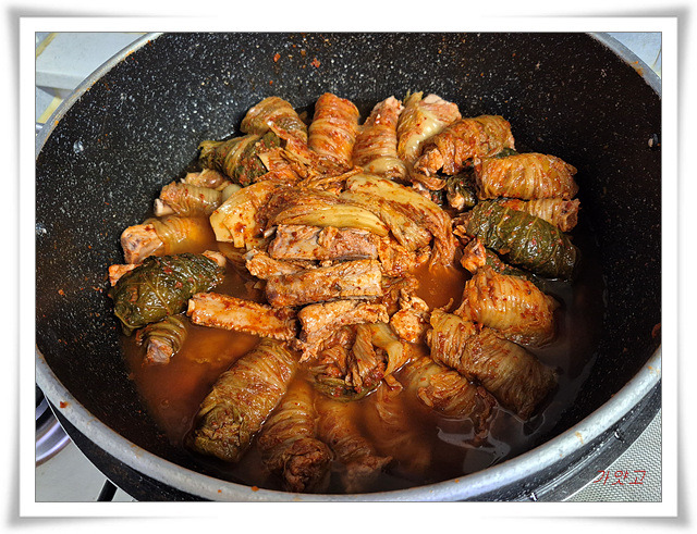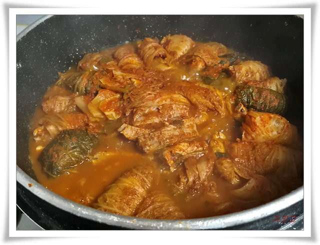 돼지등갈비 사다 묵은지를 말아 푹 조렸습니다