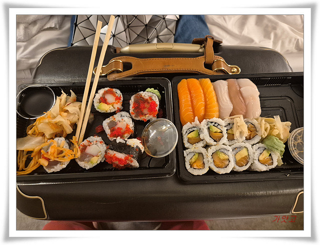 도시락으로 챙겨온 저녁을 캐리어를 밥상삼아 먹고,