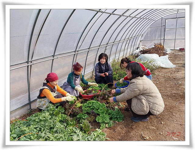 하우스 안의 텃밭에 가서 상추랑 쑥갓도 따고,