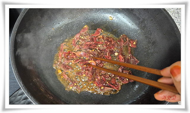 쇠고기도 센불로 바르게 볶아둡니다.