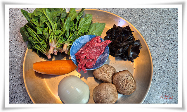 그 위에 시금치, 목이버섯, 양파, 당근을 둘러주고