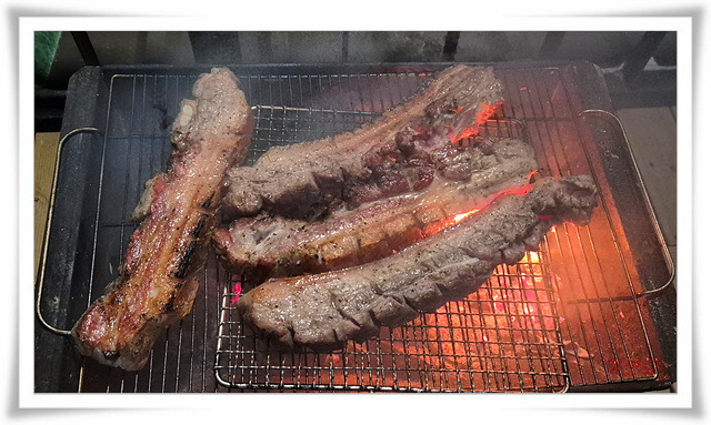 두껍게 잘라온 삼겹살을 숯불구이 해서 올리고,