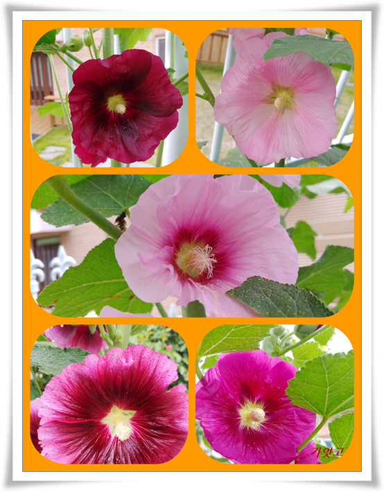 바깥화단에 색색의 접시꽃이 커다란 꽃송이 연달아 벌리고