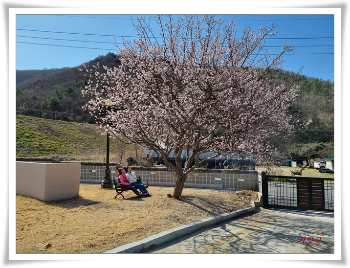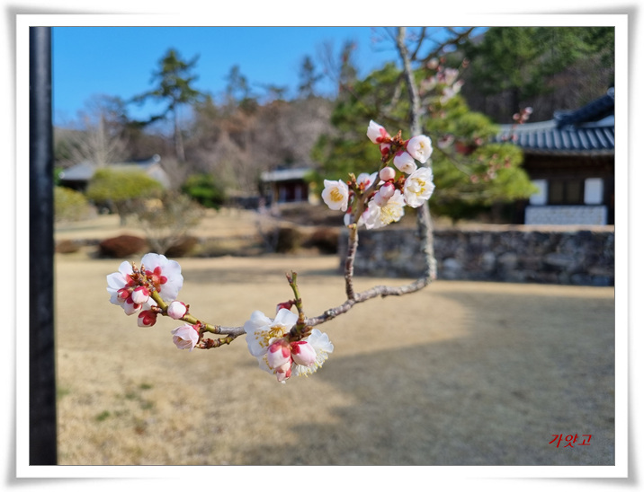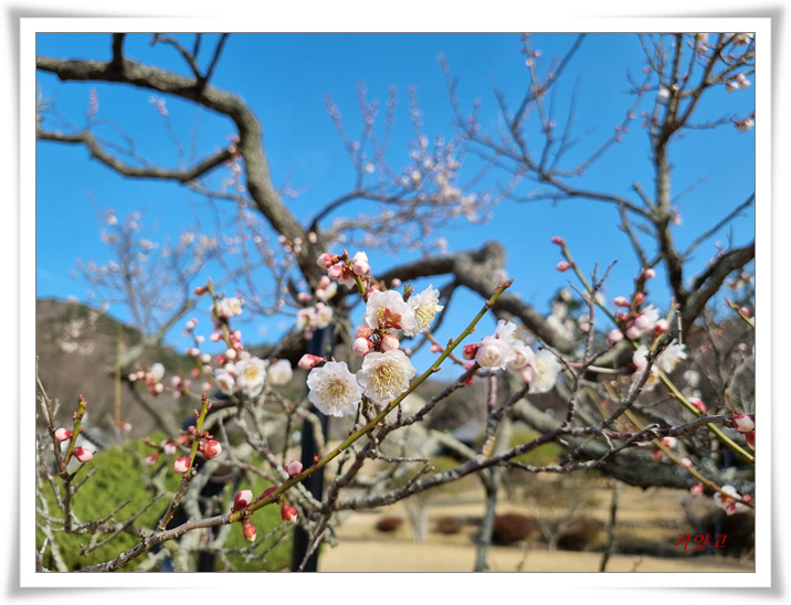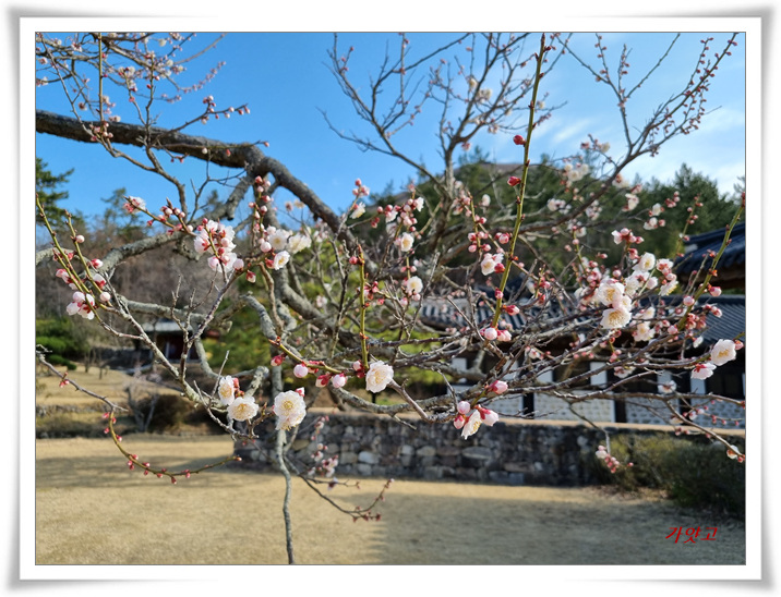 전시실 앞쪽 화단에 화사하게 피어난 매화 아래서