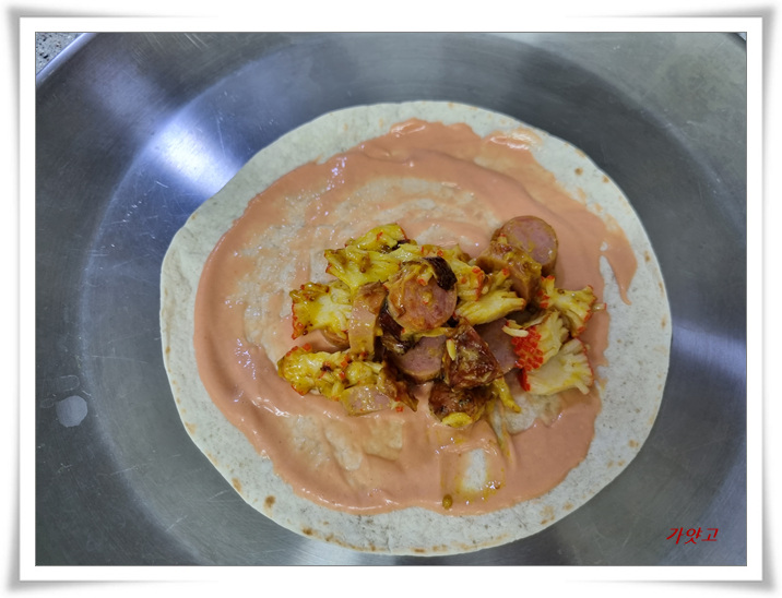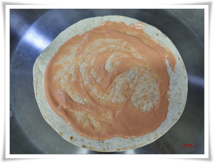 또띠아를 꺼내 마요토마토소스를 골고루 펼쳐 발라주고,