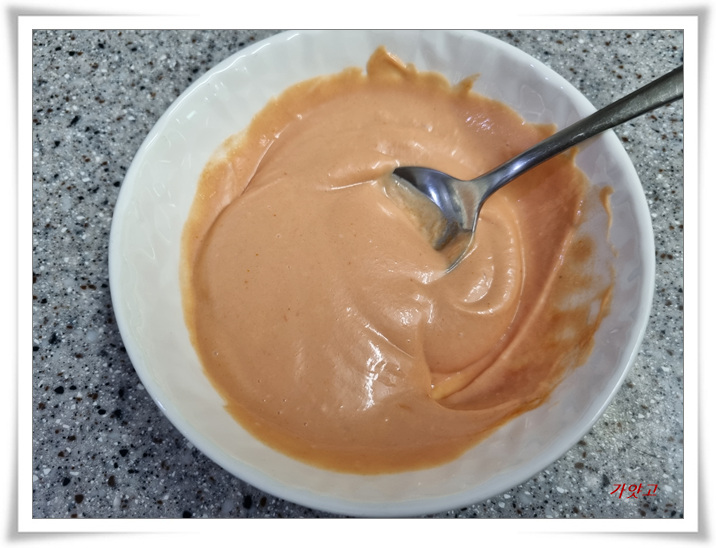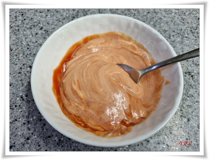 마요네즈와 토마토소스를 2:1로 섞어, 잘 저어놓고요