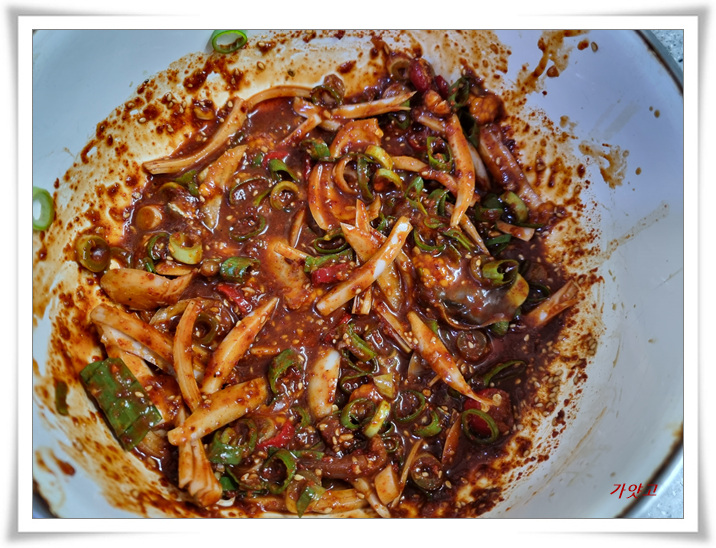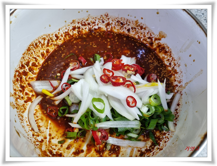 양념장에 채소들부터 넣어 골고루 섞어준 다음,